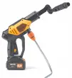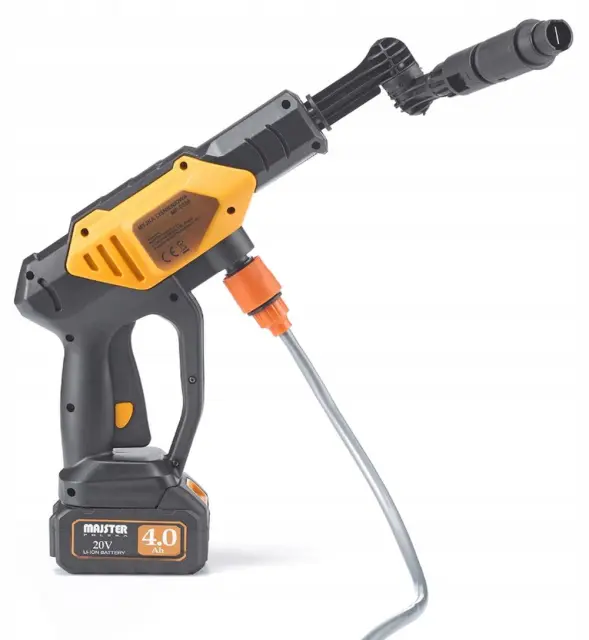 Pralni stroj je opremljen z dolgo cevjo in kompletom potrebnih šob. Zahvaljujoč baterijski moči lahko napravo vzamemo s seboj kamor koli jo potrebujemo. V kompletu je zložljivo vedro, ki omogoča uporabo pralnega stroja brez priklopa na tekočo vodo.