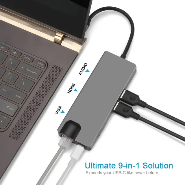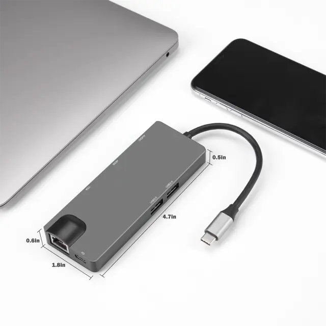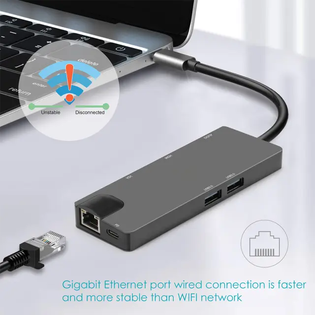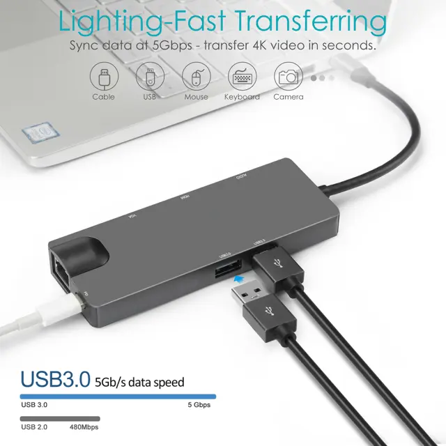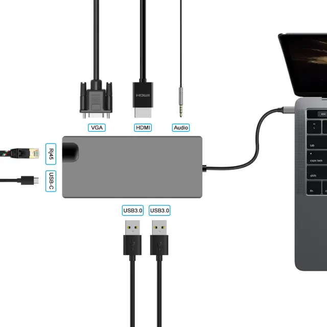 Vsestranska povezljivost: Razširite zmogljivosti svoje naprave s celovitim naborom vrat, vključno z vrati Ethernet RJ45 1000 Mb/s, vrati VGA, ki podpirajo ločljivosti do 1080p, dvema vratoma USB 3.0, 3,5 mm avdio priključkom in vrati USB-C PD za polnjenje do 100 W.