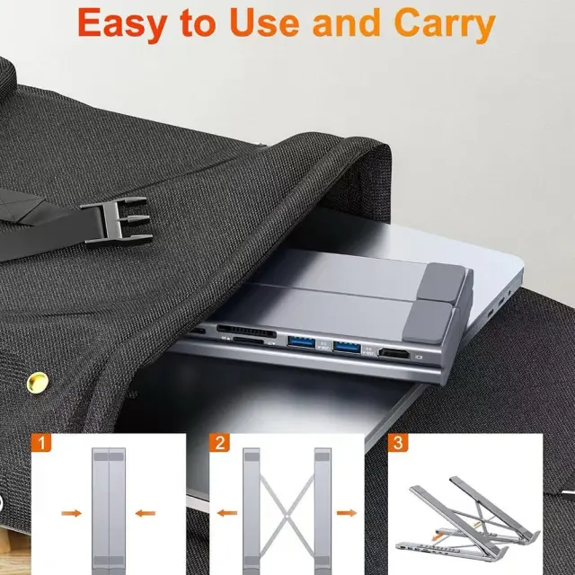 Prenosno in prostorsko varčno: Zasnovano za prenosljivost, je to stojalo za prenosni računalnik lahko in enostavno zložljivo, zaradi česar je idealno za potovanja in uporabo na poti. Priložena torba za shranjevanje omogoča priročno prenašanje in ščiti stojalo pred praskami in poškodbami. Njegova kompaktna zasnova prihrani dragocen prostor na mizi in ohranja vaš delovni prostor urejen. Ne glede na to, ali delate od doma, v pisarni ali na poti, ta prenosna postaja za prenosni računalnik zagotavlja priročno in učinkovito rešitev za razširitev zmogljivosti vaše naprave. Združljiv z različnimi znamkami prenosnikov, vključno z Garminom, ta postaja zagotavlja, da ostanete produktivni, kjer koli že ste.
