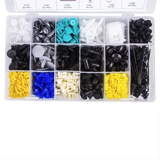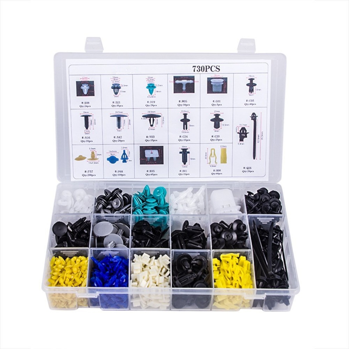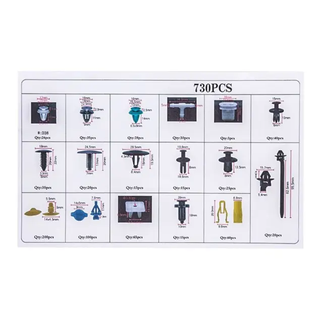 Vsestranski izbor sponk: Prosimo, upoštevajte: to niso originalni deli. Ta obsežen komplet 730 kosov ponuja široko paleto sponk, primernih za različne avtomobilske namene. Izbor vključuje različne velikosti in sloge, ki zagotavljajo združljivost s številnimi modeli avtomobilov in vrstami oblog. Če imate na voljo tako obsežen izbor, vam ni treba iskati posameznih sponk, kar prihrani čas in frustracije pri popravilu ali prilagajanju vašega vozila. Ne glede na to, ali delate na vratnih ploščah, odbijačih, blatnikih ali drugih komponentah oblog, ta komplet ponuja popoln pritrdilni element za varno in profesionalno končno obdelavo.