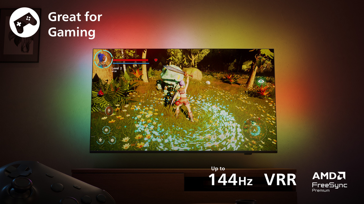 Neumorni ljubitelji igralne palice in najbolj predani igričarji bodo takoj prepoznali kakovost izjemno odzivnega igranja in gra ke, ki ne izpusti niti najmanjše podrobnosti. S frekvenco osveževanja slike 144 Hz, HDMI 2.1, izjemno majhno zakasnitvijo in tehnologijo FreeSync Premium je na voljo vse za najbolj tekoče igranje. Hkrati se boste s slogom igranja Ambilight še bolj vključili v akcijo.