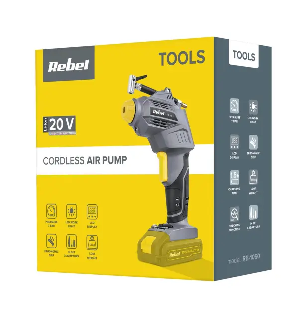 Pozabite na ročno črpalko in jo zamenjajte z brezžičnim kompresorjem iz serije Rebel Tools še danes. Zahvaljujoč dodatkom, ki so v kompletu, vam bo naprava omogočila hitro in enostavno napihovanje kolesarskih in avtomobilskih pnevmatik ter igrač in drugih napihljivih predmetov, kot so vzmetnice, žoge in otroški bazeni.