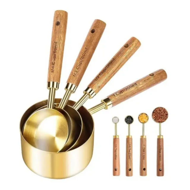 Eleganten dizajn: Izboljšajte estetiko svoje kuhinje s prefinjenim dizajnom tega kompleta zlatih merilnih žličk iz nerjavečega jekla. Kombinacija elegantnega zlatega zaključka s toplimi ročaji iz akacijevih lesa doda pridih elegance in prefinjenosti vašemu kuhinjskemu prostoru. Te merilne žličke niso le praktična orodja, temveč tudi elegantni dodatki, ki dopolnjujejo vsako kuhinjsko opremo. Vizualna privlačnost izboljša celotno kuharsko izkušnjo, zaradi česar je bolj prijetna in navdihujoča. Estetski dizajn spremeni vsakodnevno kuhanje v vizualni užitek, ki združuje funkcionalnost z eleganco.