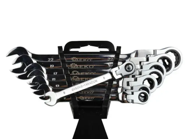 Set vključuje 8-delne tračne ključe za glavo: 8, 9, 10, 13, 15, 17, 19, 22 mm.