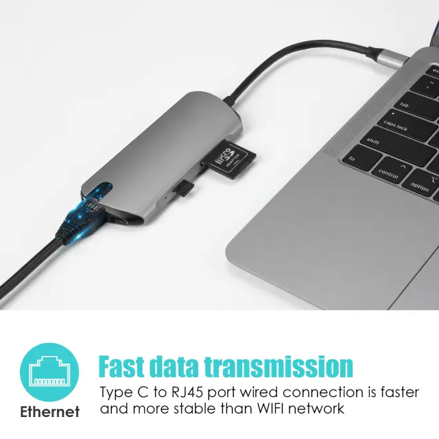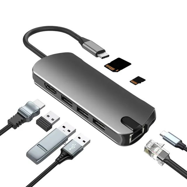 Združljivo z: napajalnik tipa C, USB-C do USB3.0 (x3), HDMI, RJ45, USB-C PD, SD, TF