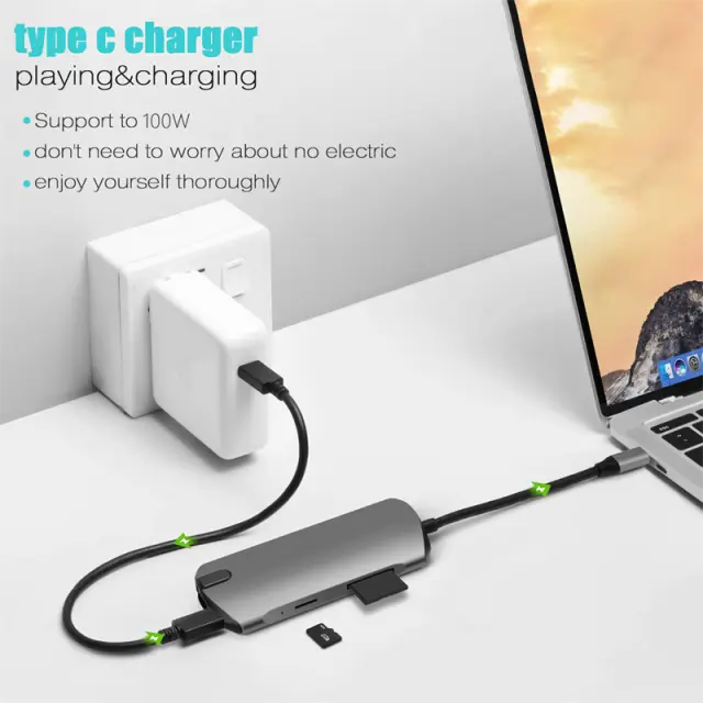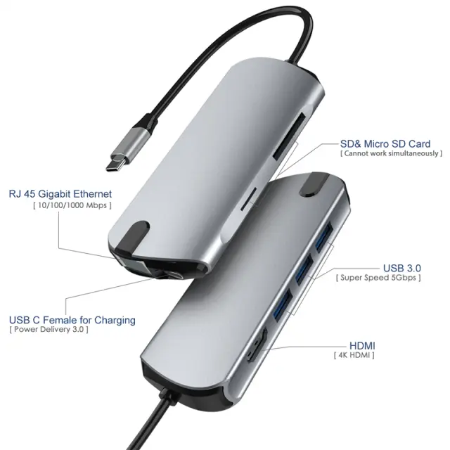 Omogoča številne povezave: zvezdišče USB-C ponuja veliko število vrat, ki povečajo povezljivost vašega prenosnika; adapter ima USB 3.0 (x3), vrata HDMI, omrežna vrata RJ45, vrata za hitro polnjenje USB-C PD in reže za pomnilniške kartice SD in TF.