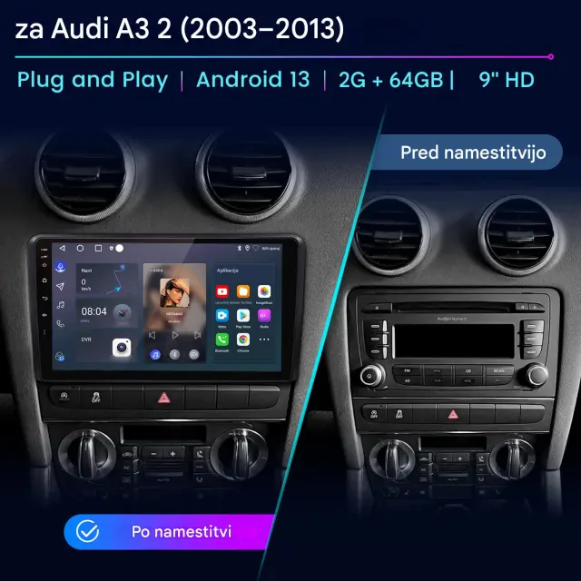 Sistem in združljivost: Ta 9-palčni multimedijski avtomobilski sistem, prilagojen za Audi A3 / S3 / RS3 (modeli 2003–2013), je opremljen z naprednim sistemom Android 13, ki je popolnoma združljiv z vozilom, kar zagotavlja stabilno in nemoteno delovanje ter uporabnikom prinaša odlično uporabniško izkušnjo.
