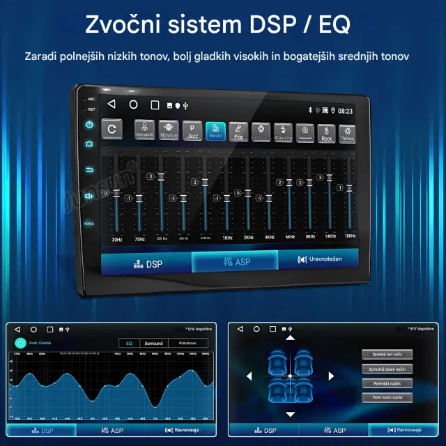 Zvočni učinki in izboljšanje delovanja: Vgrajena tehnologija DSP (digitalna obdelava signalov) lahko optimizira zvočni signal, izboljša kakovost zvoka avtomobilskega avdio sistema in ustvari visokokakovostno zvočno pojedino. Konfiguracija pomnilnika 2 + 64 GB zagotavlja nemoteno delovanje sistema in omogoča hkratno izvajanje več aplikacij brez zamrznitve, kar uporabnikom prinaša prijetno izkušnjo.