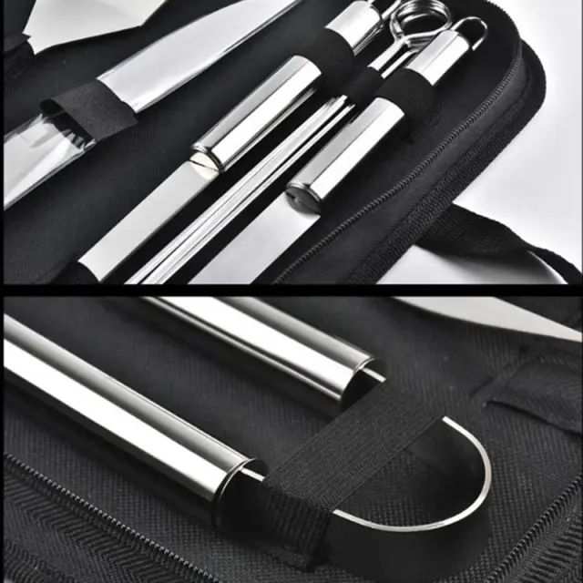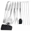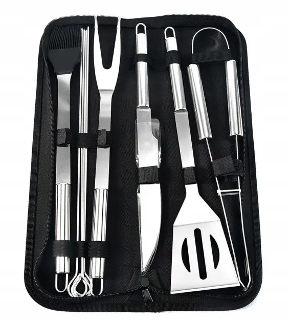 SPECIFIKACIJA – material: nerjaveče jeklo, količina: 9, komplet vsebuje: nož, vilice, lopatko, krtačo, klešče, 4 rezila, etui; mere: 38,5 / 12 / 5cm; teža: 0,8 kg