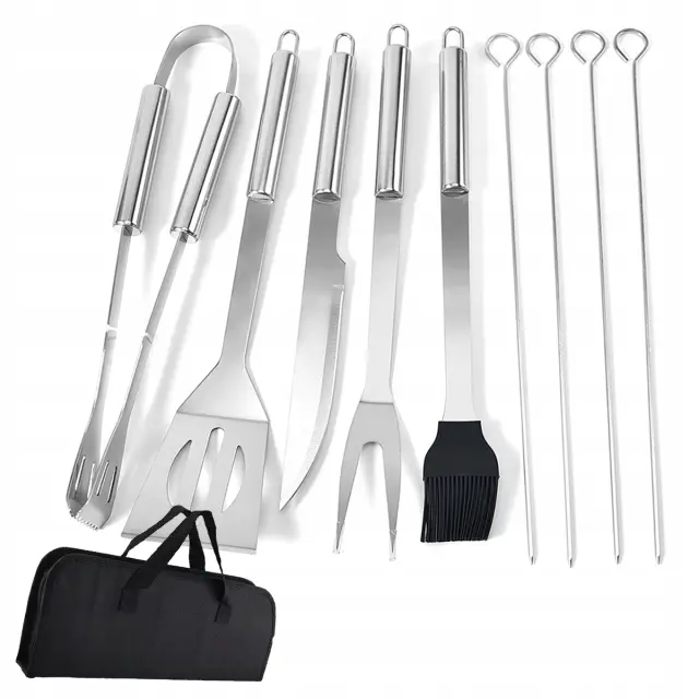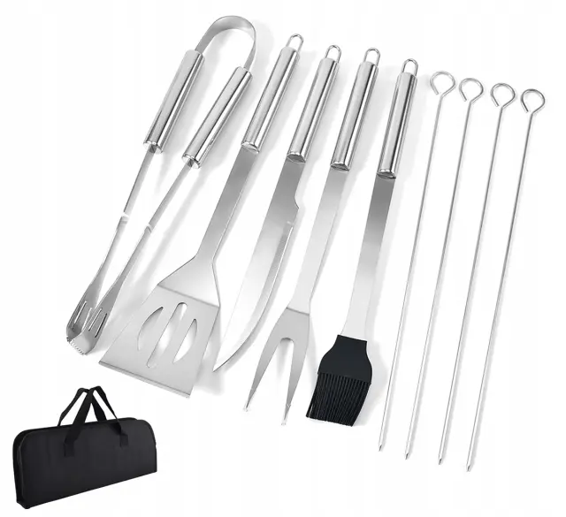 V SETU JE KAR 9 ELEMENTOV – set pribora za žar vsebuje vse, kar potrebujete za ljubiteljsko in bolj profesionalno peko na žaru. Tu najdemo oster nož, vilice, pa tudi lopatko, čopič in klešče. Poleg tega komplet vsebuje tudi 4 nabodala – popolna za pripravo nabodal .
