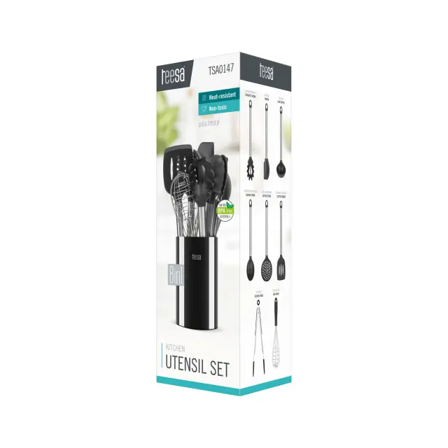 Kuhinjske posode Teesa so izdelane iz visokokakovostnega, nestrupenega in živilskega silikona. Toplotno odporen material preprečuje prijemanje hrane na površino dodatkov, kar bistveno poveča udobje pri uporabi. Uporaba silikona ima še eno prednost – ščiti vaše lončke pred praskami. Celoto dopolnjuje udoben ročaj iz nerjavečega jekla, s funkcionalno kljukico, ki omogoča obešanje na kuhinjski obešalnik.