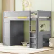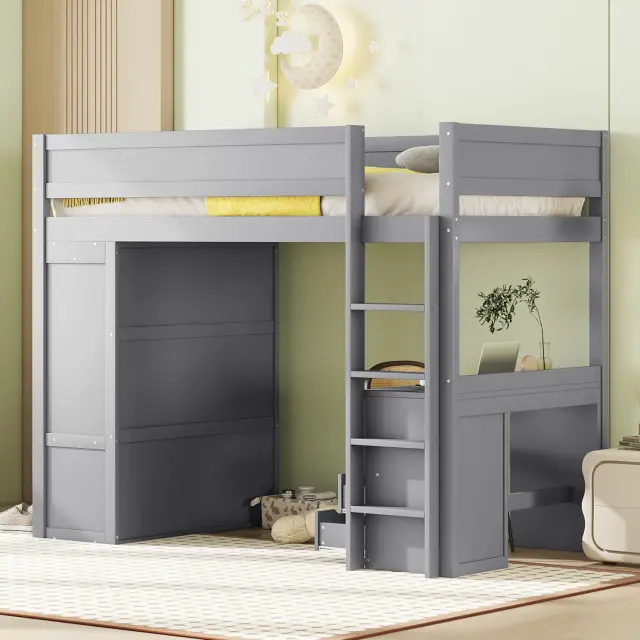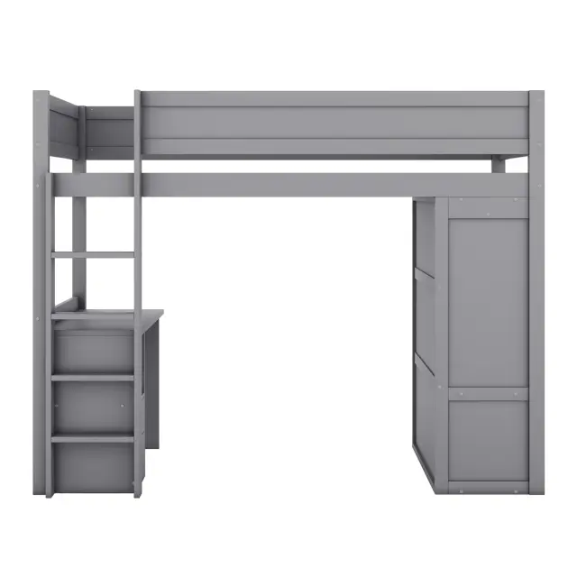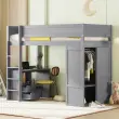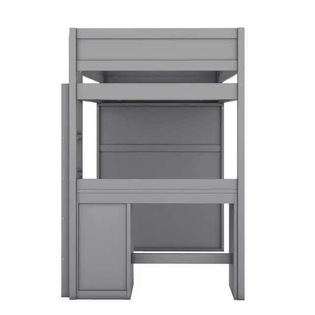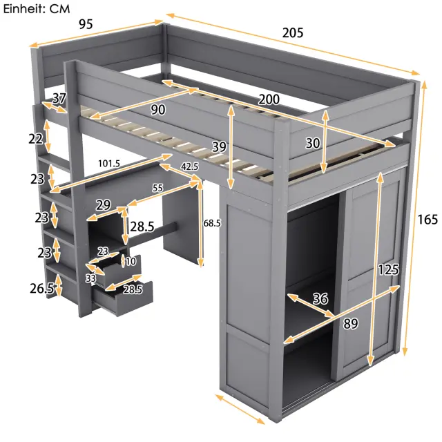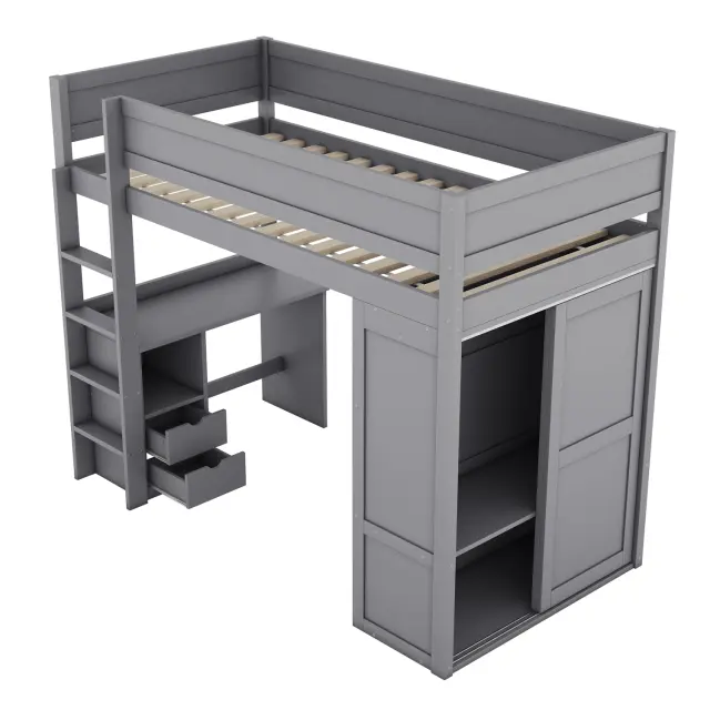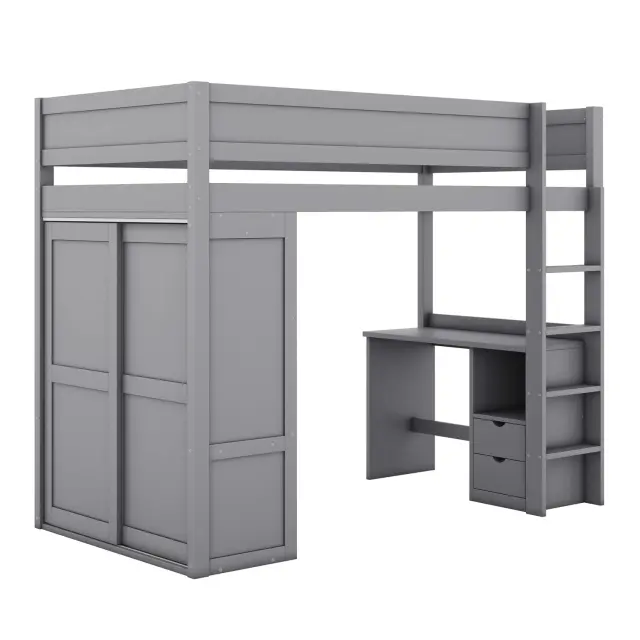 90x200cm podstrešna postelja, vsestranska otroška postelja z omaro, pisalno mizo in predali, siva