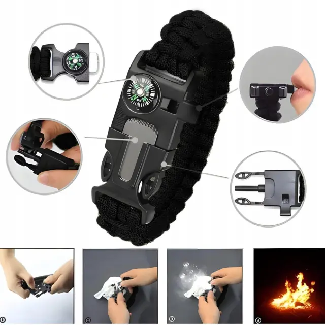 - Zapestnica 4 v 1 Zažigalnik, paracord, kompas, piščalka