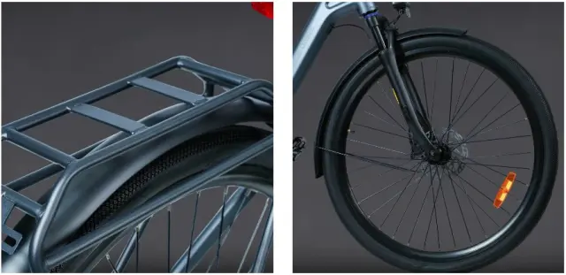 Udobje, stabilnost in premišljena mestna zasnova: Nastavljivo sprednje vzmetenje: Sprednja vilica z možnostjo zaklepa (lockout) omogoča prilagoditev glede na podlago. Vzmetenje lahko vklopiš za neravne ceste, robnike ali tlakovce, ali pa ga zakleneš za gladke mestne poti, kjer želiš več učinkovitosti in manj izgub energije.