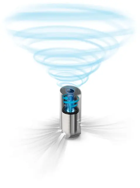 Vsesavanje zraka 360° je učinkovito v prostorih velikosti do 73 m² in zrak enakomerno porazdeli po vsem prostoru. S tem se poveča učinkovitost zračnega pretoka na 610 m³/h(2) CADR (hitrost dovajanja čistega zraka). Območje 20 m² očisti v samo 5 min.(1)