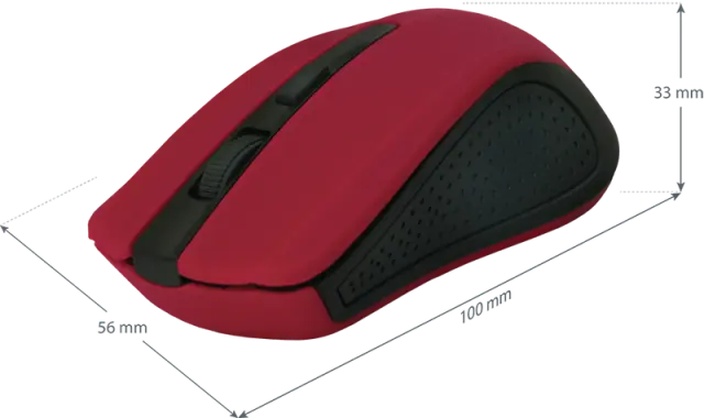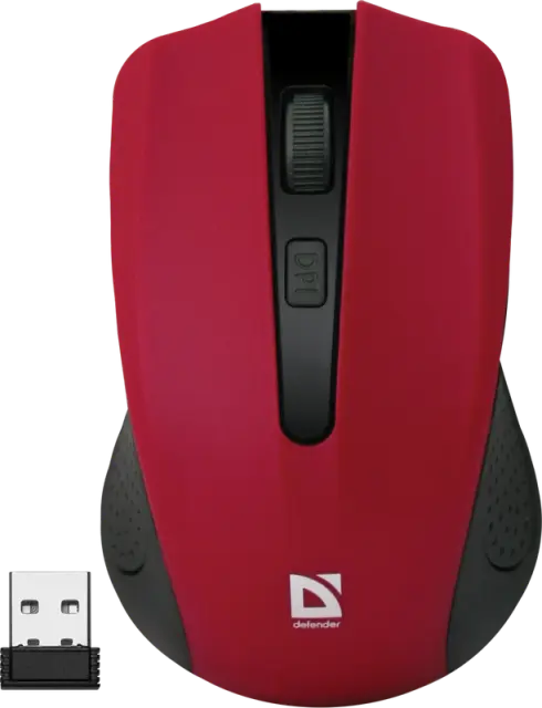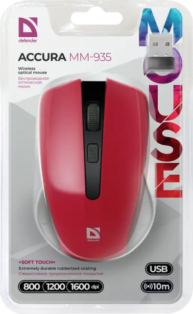 Brezžična miška Defender Accura MM-935 z rdečim ohišjem ima simetrično in ergonomsko premišljeno obliko, zaradi česar je udobna tako za desno kot levo roko. Opremljen je z dvema osnovnima tipkama, drsnim kolescem in stikalom, s katerim lahko spremenite raven občutljivosti senzorja. Optični LED senzor, uporabljen v tem modelu, podpira delo z ločljivostjo 800-1600 dpi.
