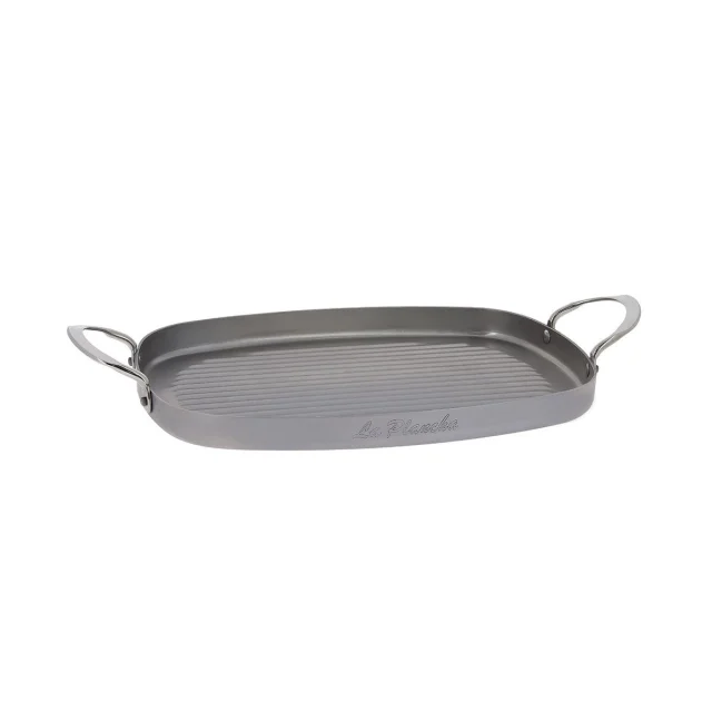 Železna ponev za žar DE BUYER MINERAL B Acier z dvema ročajema iz nerjavečega jekla je idealna ponev za pripravo vseh vrst mesa. Ponev, poimenovana »Plancha«, omogoča pripravo mesa kot na žaru, brez dodajanja maščobe. Dno ponve ima oblikovane grebene, ki zrezkom dodajo zapečen črtast vzorec, hkrati pa zmanjšujejo lepljivost površine, zato se meso lepše zapeče. Ponev je odlična tudi za pripravo Jakobovih pokrovač (capesante), kozic, rib, zelenjave … Ponve iz linije MINERAL B so narejene iz visokokakovostnega železa, prevlečenega s čebeljim voskom, ki ustvari zaščitni premaz pred oksidacijo, hkrati pa je to tudi naravna obloga proti sprijemanju živil pri prvi uporabi. Večkratna uporaba izboljša lastnosti naravnega nelepljivega sloja, pri visokih temperaturah pa železo še dodatno karamelizira sokove in naredi zrezek še bolj okusen in sočen. Ponev je primerna za vse kuhalne površine, vključno z indukcijo in vročim ogljem. Ne uporabljajte detergentov in ponve ne vstavljajte v pomivalni stroj. Ponev po vsaki uporabi sperite z vročo vodo, jo osušite, nato pa jo rahlo premažite z oljem in shranite v suhem prostoru, da preprečite rjavenje.