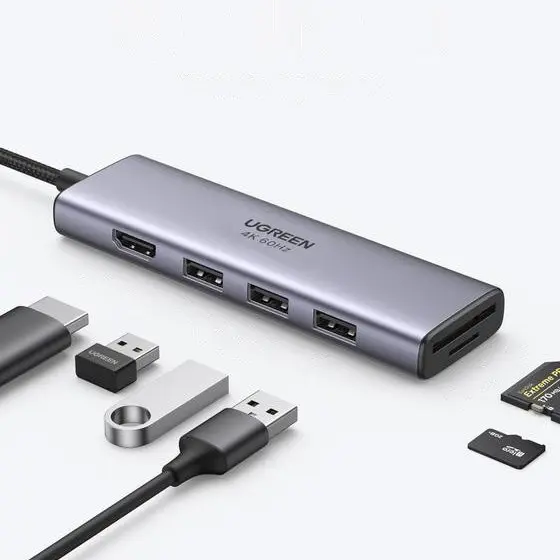 Razširite zmogljivosti vašega računalnika ali prenosnika. Večnamenski adapter UGREEN CM511 ponuja do 6 uporabnih vrat - 3 vrata USB3.0, vrata HDMI in reže za kartice SD in micro SD. Naprava omogoča prikaz videa 4K odlične kakovosti in prenos datotek s hitrostjo do 5Gbps. Odlikujejo ga tudi univerzalna združljivost, kompaktna velikost in robustna oblika.