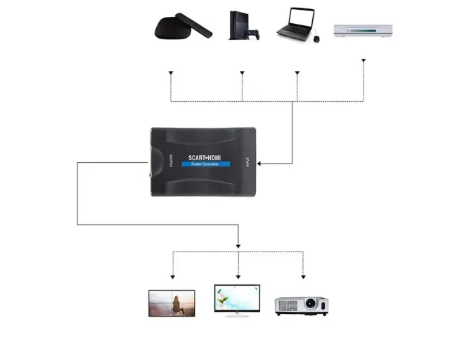 Adapter pretvornik SCART v HDMI AV euro FULL HD je popolnoma združljiv z vsemi napravami, ki imajo SCART izhod, kot so računalniki, prenosni računalniki, igralne konzole, DVD predvajalniki, digitalni sprejemniki in še več. Enostavno ga priključite na vašo napravo preko HDMI kabla in nato povežite adapter s scart AV euro priključkom na vašem televizorju ali drugi napravi.