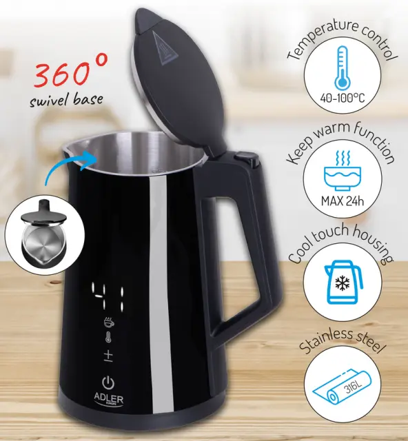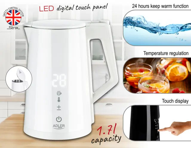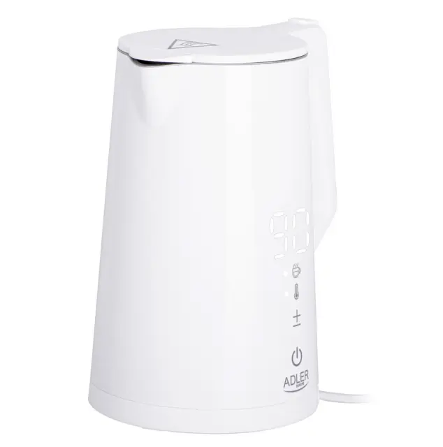 Električni grelnik vode Adler AD 1345 white ima LED zaslon in regulacijo temperature, kapaciteta znaša 1,7L. Opremljen je s STRIX varnostnim sistemom, ki preprečuje vklop praznega grelnika in samodejno izklopi po vrenju. Dvojno stensko ohišje omogoča hitro vrenje vode. Nudi temperaturne nastavitve od 40°C do 100°C, funkcijo ohranjanja toplote in ohišje, ki se ne segreva. Maksimalna moč grelnika je 2200W.