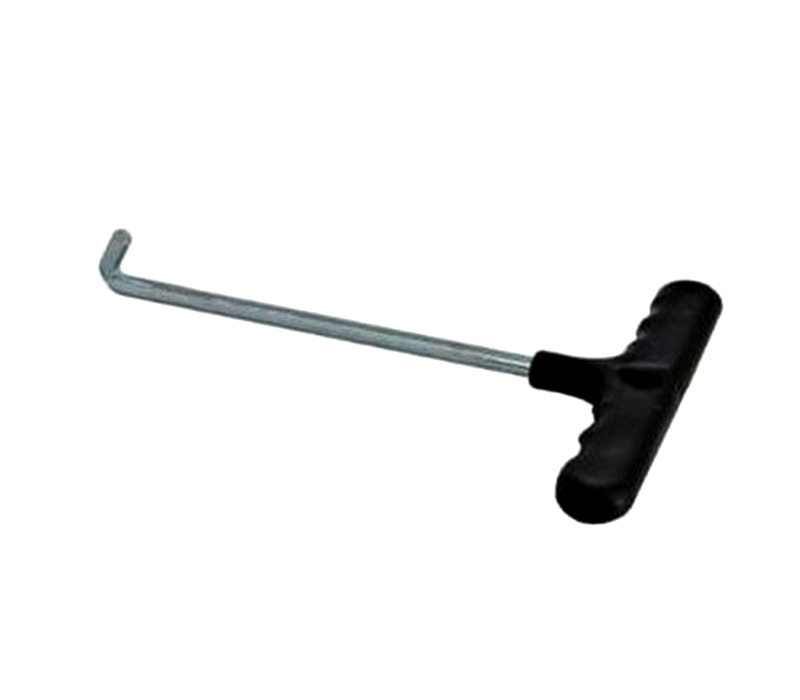 Napenjalni kavelj z ergonomskim ročajem za lažjo pritrditev odbojnih vzmeti na konstrukcijo trampolina.