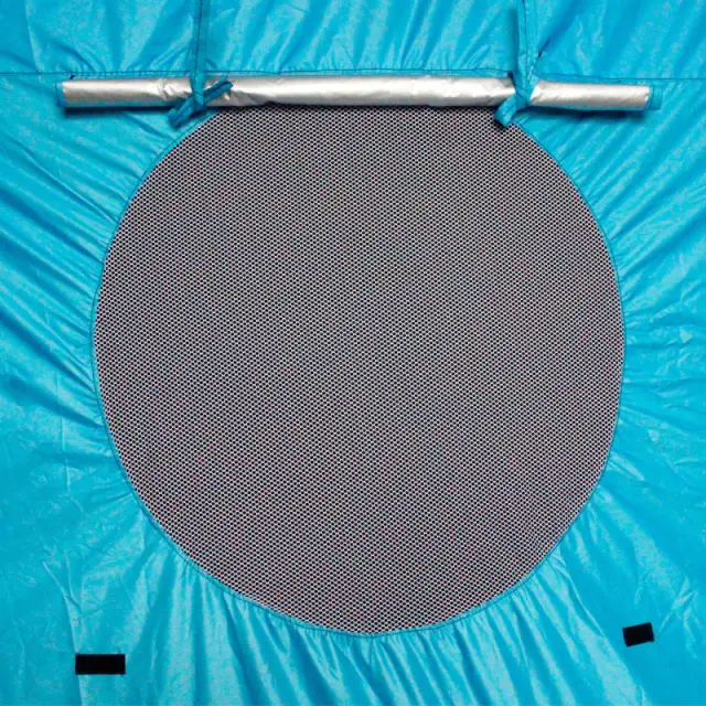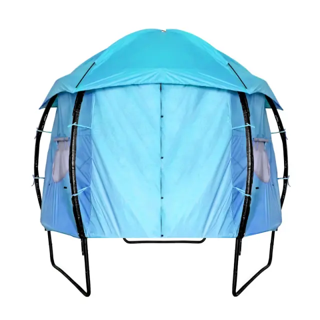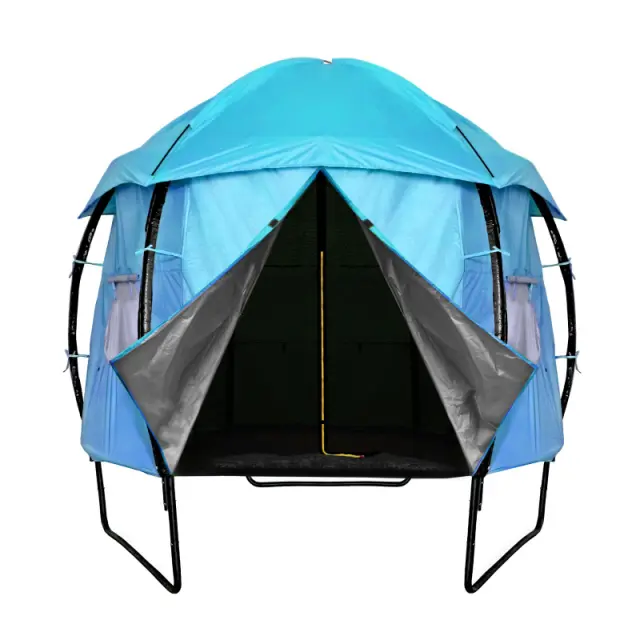 Kadar trampolin ni v aktivni uporabi, šotor pomaga zaščititi površino za skakanje pred umazanijo in UV žarki.