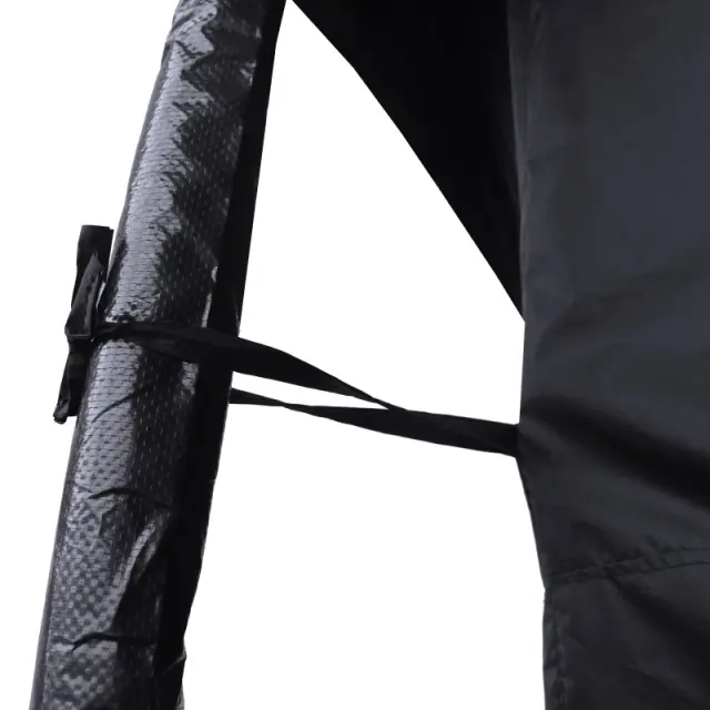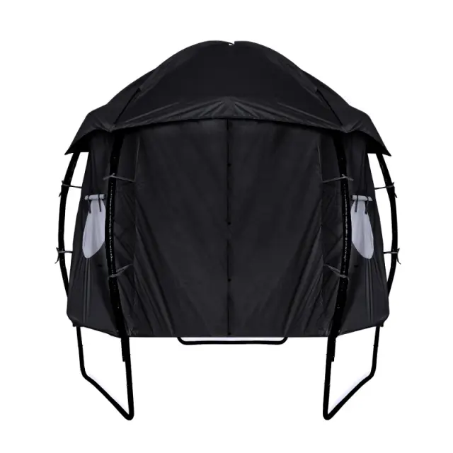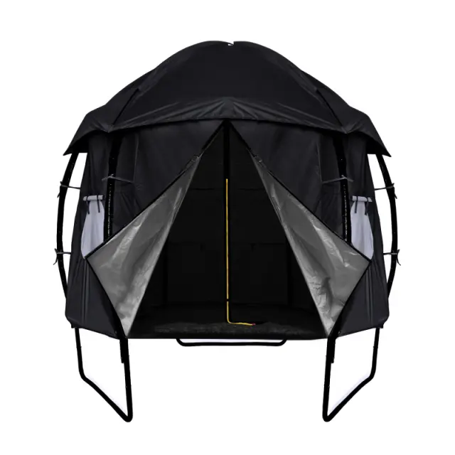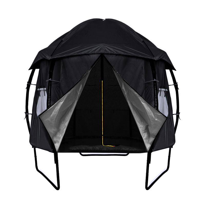 Kadar trampolin ni v aktivni uporabi, šotor pomaga zaščititi površino za skakanje pred umazanijo in UV žarki.