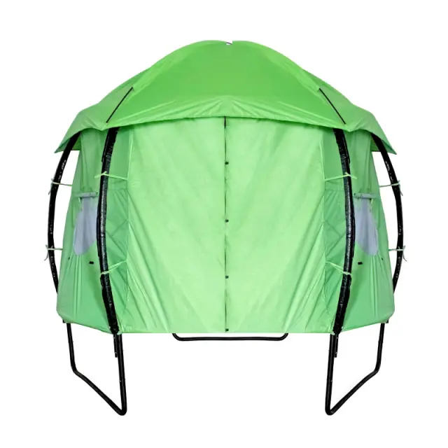 Kadar trampolin ni v aktivni uporabi, šotor pomaga zaščititi površino za skakanje pred umazanijo in UV žarki.