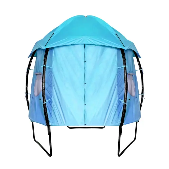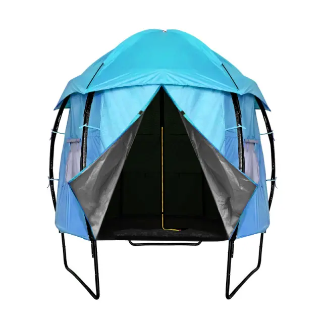 Kadar trampolin ni v aktivni uporabi, šotor pomaga zaščititi površino za skakanje pred umazanijo in UV žarki.