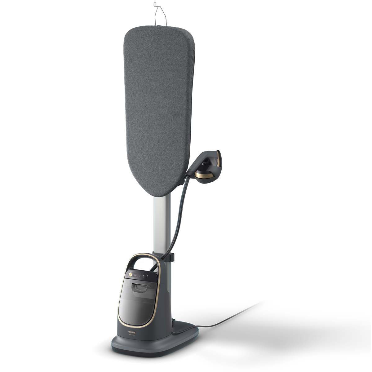 Vgrajena likalna deska, nastavljiva pod več koti, se zoži in nagne v kateri koli položaj za prilagodljivo in priročno uporabo. Za vodoravno likanje najtežavnejših tkanin ali navpično likanje najobčutljivejših oblačil.