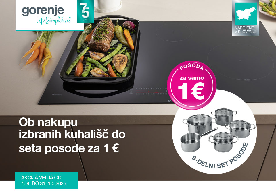 Ob nakupu izbranih kuhališč Gorenje in po registraciji na spletni strani Gorenje prejmeš poleg kuhališča še 9-delni set posode za 1€.