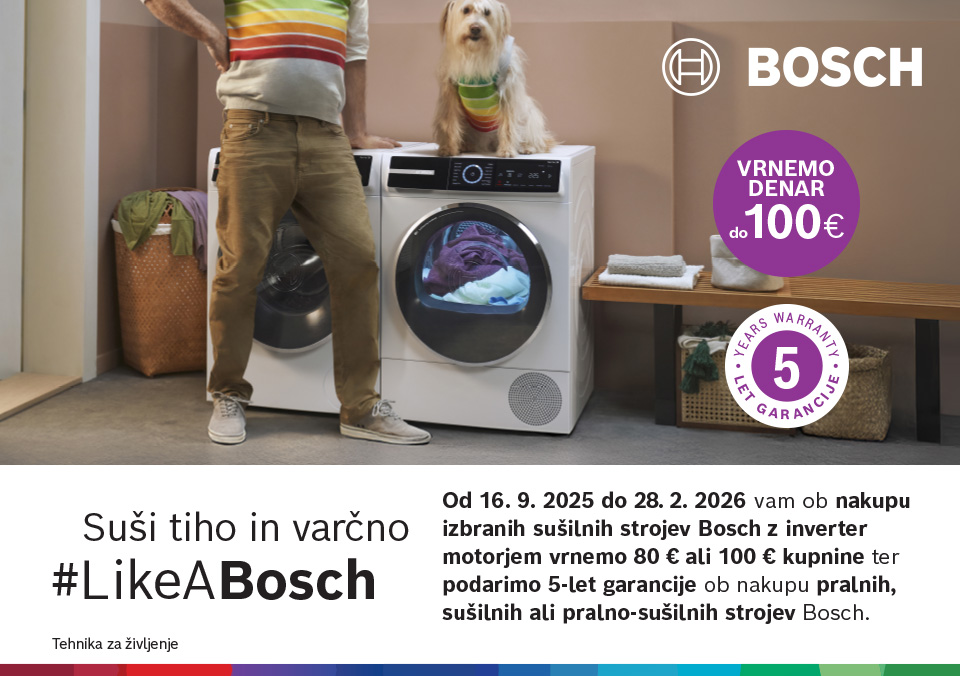 Od 16. 9. 2025 do 28. 2. 2026 ob nakupu izbranih sušilnih strojev Bosch z inverter motorjem pridobi 80 € ali 100 € vračila kupnine z registracijo preko portala MyBosch.