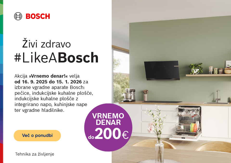 Od 16. 9. 2025 do 15. 1. 2026 ob nakupu izbranih vgradnih aparatov Bosch pridobi do 200 € vračila kupnine z registracijo preko portala MyBosch.