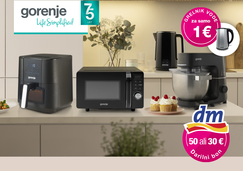 Ob nakupu izbranih malih gospodinjskih aparatov Gorenje pridobi dm darilni bon v vrednosti 30 € ali 50 € ali grelnik vode za samo 1 €.