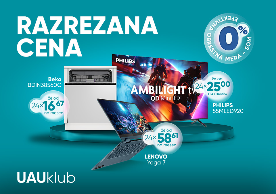 Razreži ceno bele tehnike, televizorjev, izdelkov za osebno nego, malih hišnih aparatov, prenosnikov in mobilnih telefonov na do 24 obrokov, brez obresti in stroškov! Ponudba je na voljo za člane UAU kluba in velja za izbrane izdelke prodajalca Big Bang v obdobju od 1. do 31. 3. 2026 oziroma do razprodaje zalog.