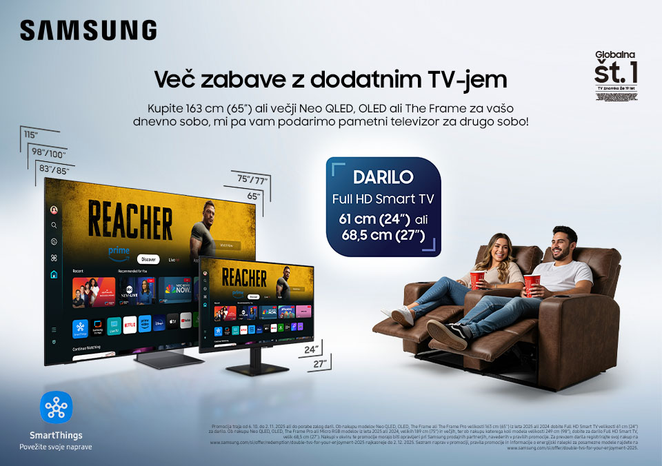 - Kupi Neo QLED, OLED ali The Frame Samsung TV velikosti 65" (163 cm) ali več, v obdobju od 6. 10. do 2. 11. 2025.