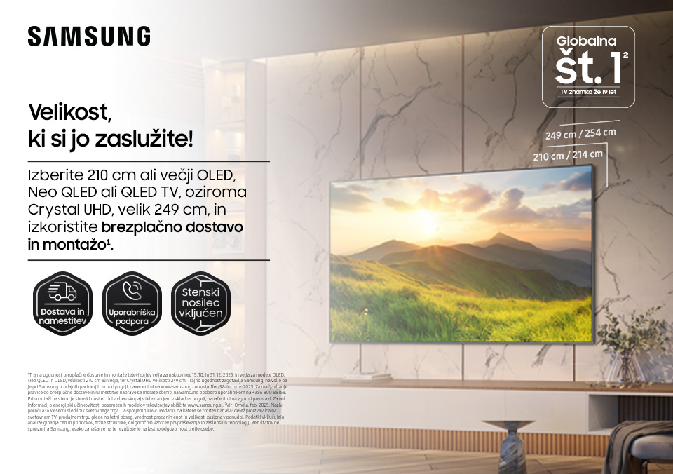 Izberi 210 cm ali večji OLED, Neo QLED ali QLED TV, oziroma Crystal UHD, velik 249 cm, in izkoristi brezplačno dostavo in montažo.