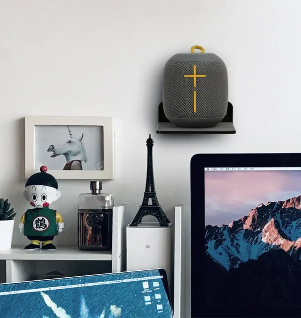 Zasnova, ki prihrani prostor: ta stenska organizatorska polica pomaga sprostiti vaš prostor, saj zagotavlja namensko mesto za shranjevanje zvočnikov Bluetooth, ki jih drži stran od pultov in miz.