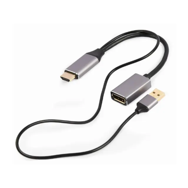 Aktivni adapterski kabel HDMI moški na DisplayPort ženski. Potrebeno je napajanje, preko vgrajenega dodatnega priključka USB. Podpira ločljivosti do 4K pri 60 Hz.