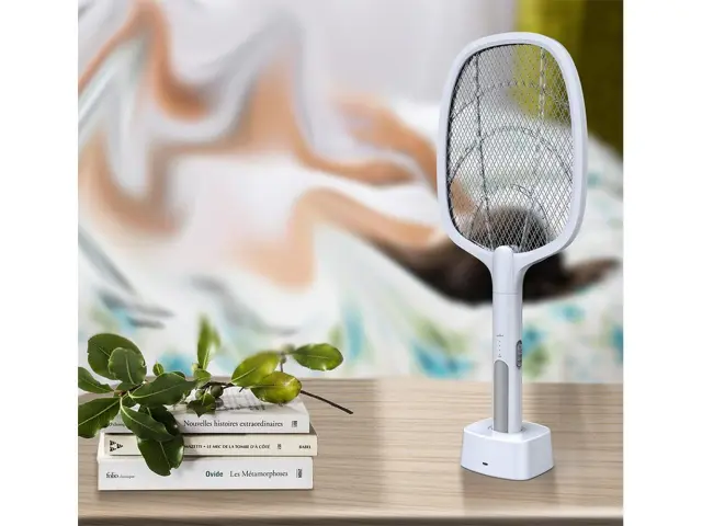 Poleg tega ima električna raketa funkcijo insekticidne svetilke. Postavite ga lahko v stojalo, ki je priloženo v kompletu. To je izdelek, ki uporablja vir UV svetlobe za učinkovito privabljanje komarjev in drugih žuželk.