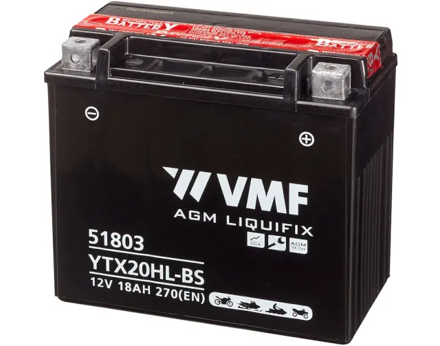 Proizvajalec : VMF</span><br /><span>Model proizvajalca: YTX20HL-BS </span><br /><span>Tehnologija: brez vzdrževanja </span><br /><span>YUASA zamenjava: 65989-90B 65989-97B Harley Davidson</span><br /><br /><strong>TEHNIČNE LASTNOSTI:</strong><span> </span><br /><span>Napetost: 12 V</span><br /><span>Kapaciteta: 18 Ah/10HR</span><br /><span>Zagonska moč CCA @ -18°C: 270 A </span><br />Polnilni tok: 2.0 amp.</span><br /><br /><strong>DIMENZIJE / TEŽA:</strong><br /><span>Dimenzije - dolžina (mm): 175 mm, +/- 2 mm</span><br /><span>Dimenzije - širina (mm): 87 mm, +/- 2 mm</span><br /><span>Dimenzije - višina (mm): 155 mm, +/- 2 mm</span><br /><span>Terminali (tip priključka): 20 </span><br /><span>Polariteta:</span><strong> -ΠΠΠ+ </strong><br /><span>Teža 6.02 kg</span><br /><br /><strong>VSEBINA KOMPLETA</strong><span> :</span><br /><span>V kompletu: 1 x akumulator, 1 x navodila za uporabo, vijaki</span><br /><br /><span>OPOMBE: <br />- Navedena vrednost zagonskega toka predstavlja orientacijsko vrednost. <br />- Kapaciteta akumulaterja je izražena v Ah/10HR <br /> - Če motor dlje časa ni v uporabi (zima!), akumulator priključite na sodoben večstopenjski zunanji polnilec in vzdrževalec akumulatorjev, kjer ga imate lahko priključenega dlje časa brez skrbi za stanje vašega akumulatorja. Z uporabo vzdrževalca akumulatorja boste občutno podaljšali življensko dobo akumulatorja. Ob nakupu vprašajte za nasvet in svetovali vam bomo optimalno rešitev, prilagojeno vašemu izbranemu modelu akumulatorju!</span></p><p>Fotografije ne zagotavljajo lastnosti izdelkov, so simbolične in ne odražajo vedno v celoti dejanskega stanja.</p>