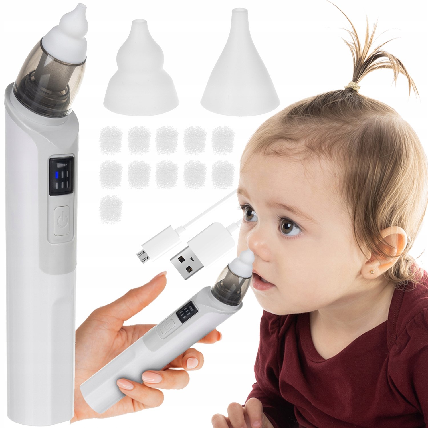 2 KONICI IN 11 FILTROV – 2 mehki silikonski konici sta pritrjeni na aspirator. Ena za dojenčke, druga za otroke nad 2 leti . Poleg tega ima naprava 11 zamenljivih filtrov. Aspirator je izjemno enostaven za čiščenje in vzdrževanje čistega.
