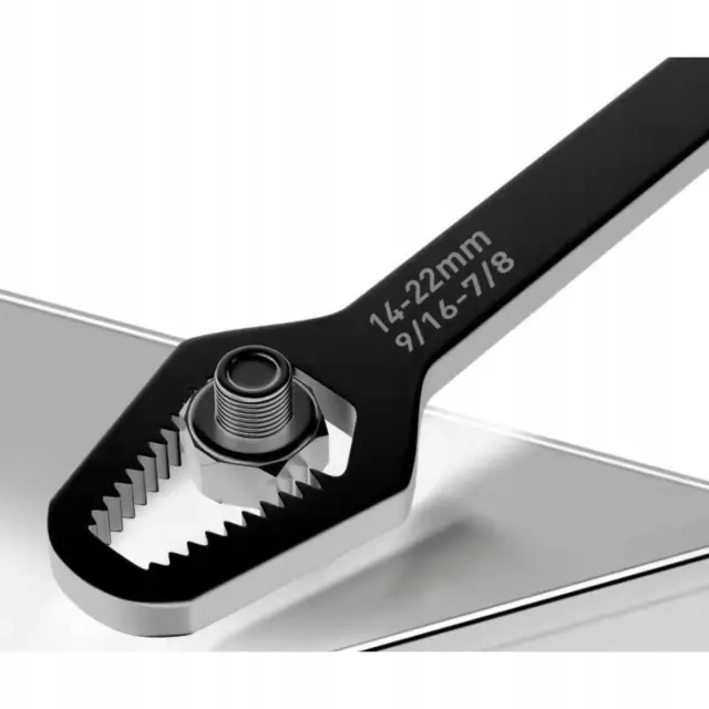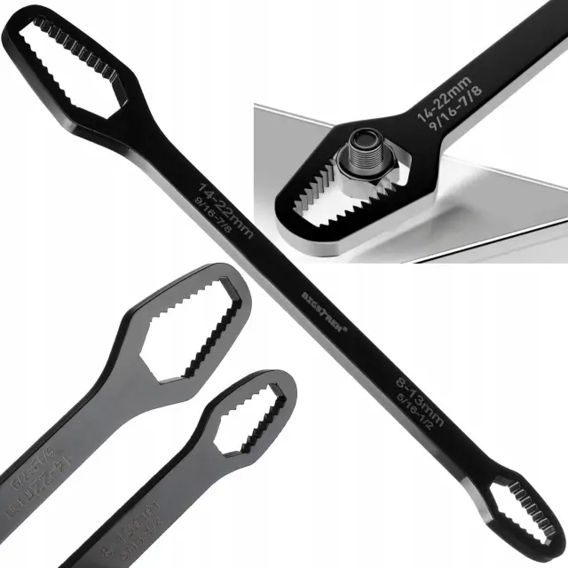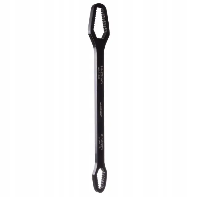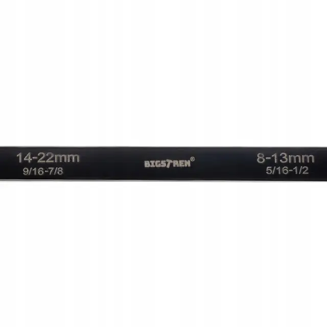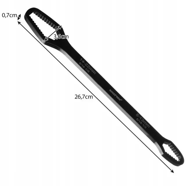 SPECIFIKACIJE – črna barva; material: ogljikovo jeklo; razpon manjše mreže: 8 – 13 mm; 5/16″ – 1/2″; E-10–E-14; večji razpon mrežnih očes: 14 – 22 mm; 9/16″ – 7/8″; E-16–E-24; mere: 26,7 x 3,6 x 0,7 cm; teža: 168 g