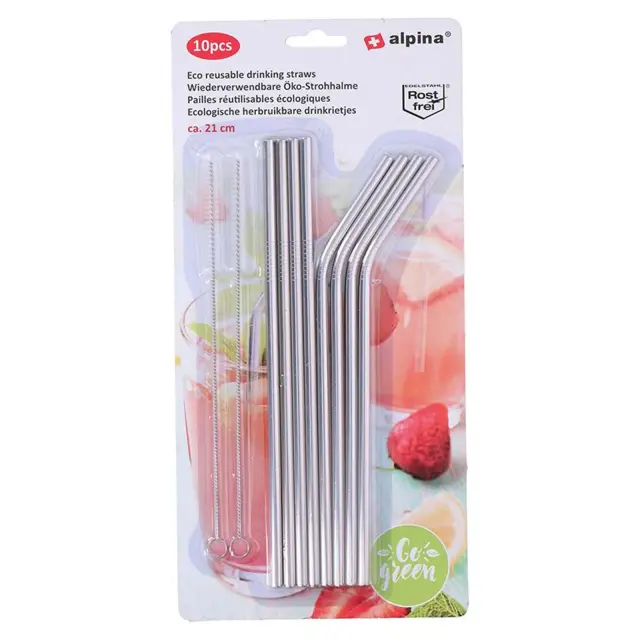 Alpina, Kovinske slamice s ščetkami za čiščenje, 10 kosov, ponovno uporabne, ekološke, Srebrna