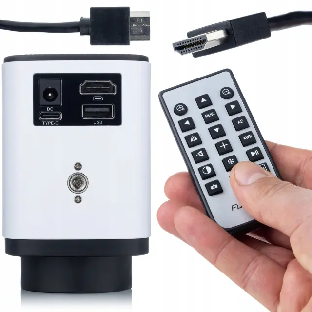 Vse nastavitve je mogoče spreminjati z daljinskim upravljalnikom, brez potrebe po dotiku naprave. Zaradi tega je delo z mikroskopom udobno, hitro in natančno – tako pri dokumentiranju slike kot v realnem času.