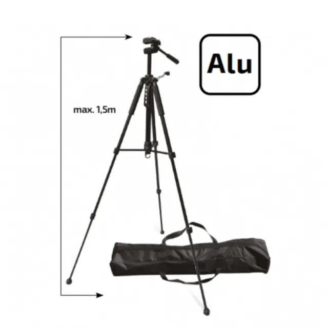 Največja višina stojala po raztegovanju je 150 cm. Stativ ima montažni navoj 1/4 “. Platformo, na katero je pritrjen laser ali kamera, je mogoče nastaviti pod katerim koli kotom.