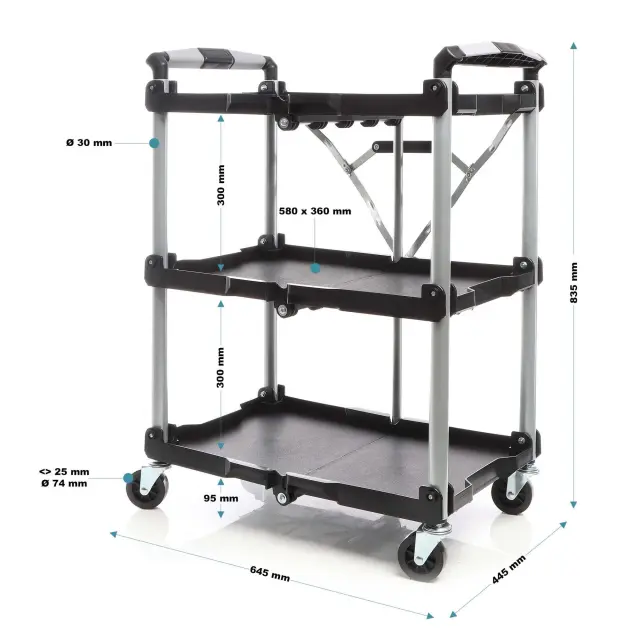 Ta voziček velikosti 38 x 72 x 85 cm navdušuje ne le s prostorsko varčno zasnovo, ampak tudi z visoko odpornostjo. Ima robusten aluminijast okvir in nivoje je mogoče obremeniti vsako z največ 50 kg – vendar ne hkrati, saj je skupna obremenitev celotnega vozička 120 kg. Voziček je opremljen z varnimi potisnimi drogovi, ki omogočajo udobno in varno manevriranje. Zahvaljujoč štirim plastičnim vrtljivim koleščkom ga je mogoče enostavno premikati in uporabljati prilagodljivo.