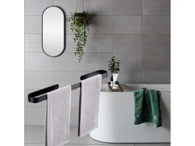 Material: aluminij Montaža z montažnim lepilom ali vijaki Barva: črna mat Dolžina: 30 cm Širina: 6 cm Dolžina roke: 10 cm