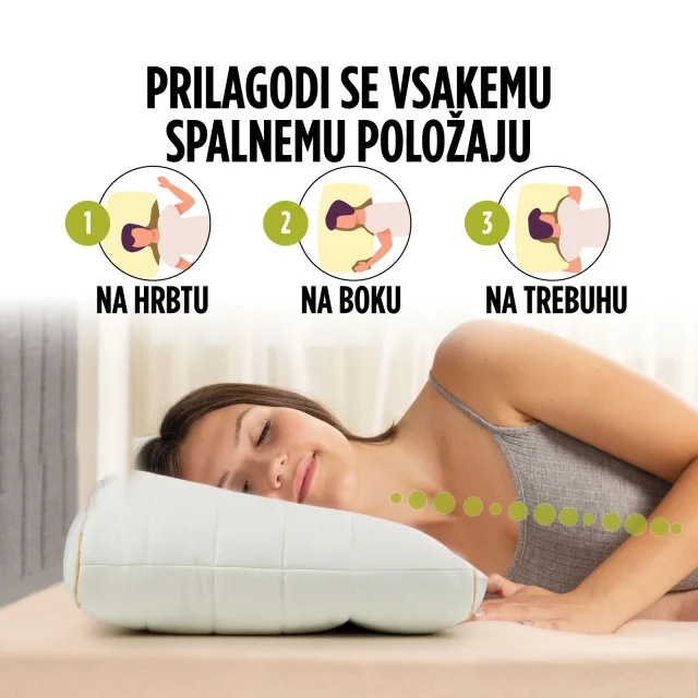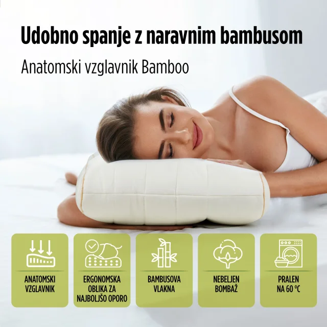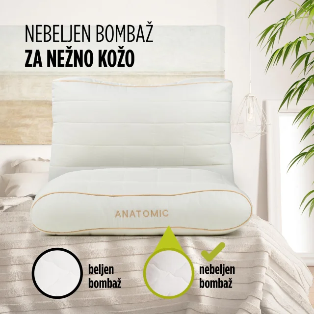 Anatomski vzglavnik nudi odlično podporo vratu. Primeren za vse spalne položaje. Kombinacija nebeljenega bombaža in naravnih bambusovih vlaken v prevleki vzglavnika je bila ustvarjena tudi za najbolj občutljivo kožo. Vzglavnik je primeren za vse, ker si ga lahko nastaviš na svojo najljubšo višino in trdoto.