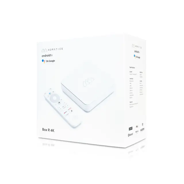 Android box HD HOMATICS BOX R Android TV je najmočnejši multimedijski streamer na trgu, ki navaden TV spremeni v pametni TV. Operacijski sistem je najnovejši Android TV 11. Za hitre odzive bo poskrbel zmogljiv procesor Amlogic S905X4, ki podpira do 2 GB DDR RAM in 16 GB eMMC Flash. Homatics Box R preseneča z odlično opremo in povezljivostjo, kot so priključek Ethernet , USB tipa C , USB 3.0, USB 2.0, optični digitalni avdio izhod S/PDIF , bralnik za kartice MicroSD, WiFi 5 in Bluetooth 5.0.